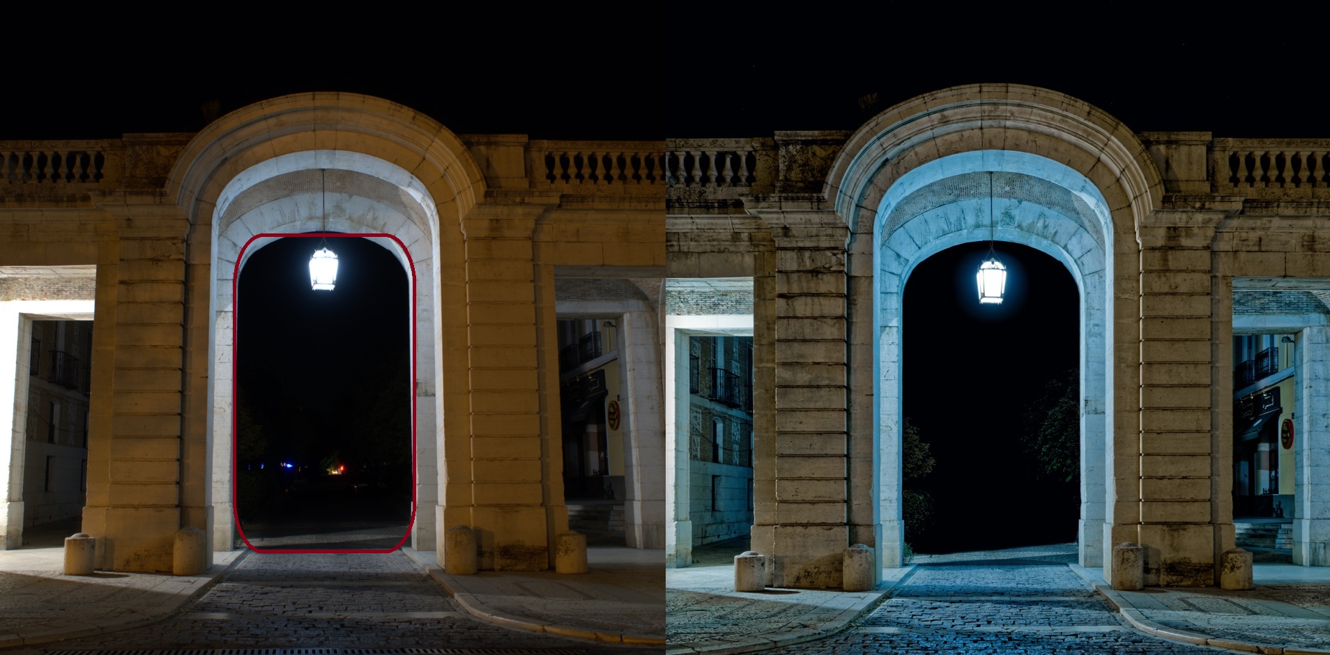 Aproveché que se fue la luz esa noche en la calle que conecta con el arco, y se me ocurrió la idea de crear esta fotografía, oscureciendo la entrada y dejando la ténue luz colgando del techo, como último aviso para los aventureros.